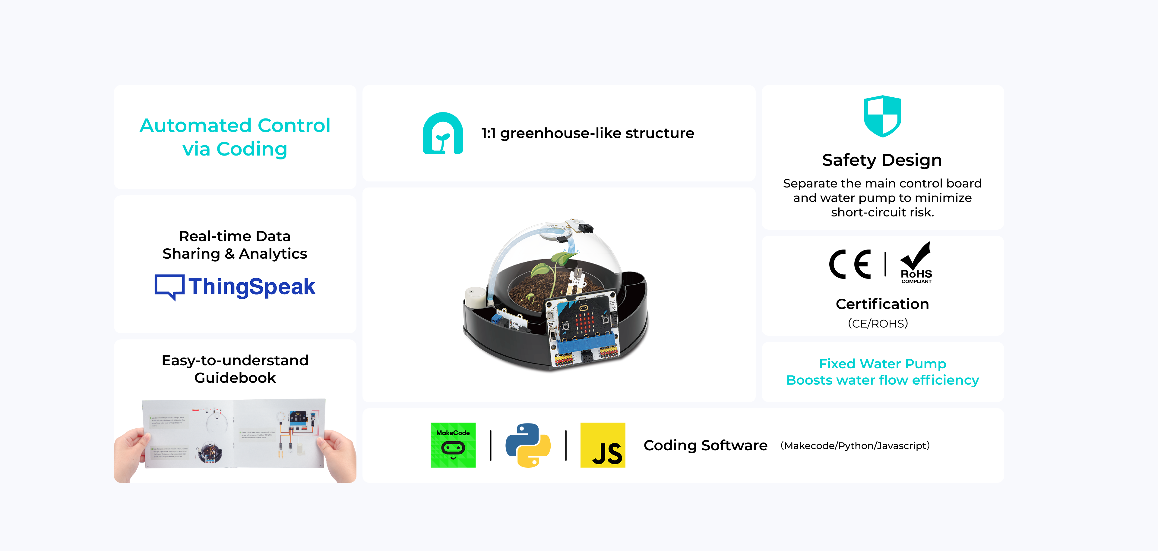 The ELECFREAKS Smart Greenhouse Kit helps students understand smart planting. It uses micro:bit and IoT:bit, allowing observation of plant growth in a transparent greenhouse. Sensors monitor light and soil moisture, while rainbow light rings adjust lighting, and a water pump automates watering. Students program the kit to control the environment and share data on the IoT dashboard.
